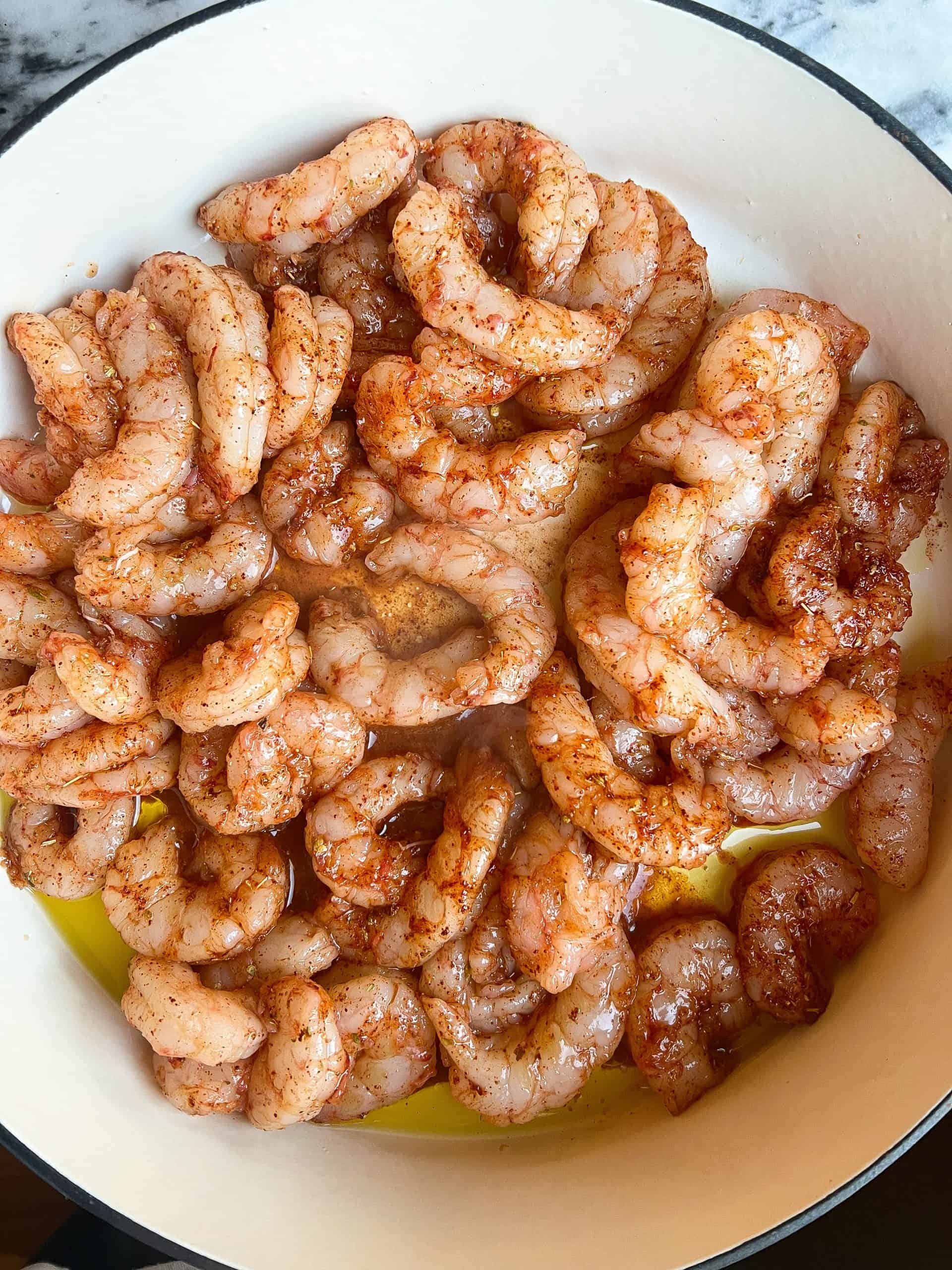 - Add oil to a large skillet over medium-high heat. Add seasoned shrimp and cook about 2-3 minutes per side. Remove and set aside.